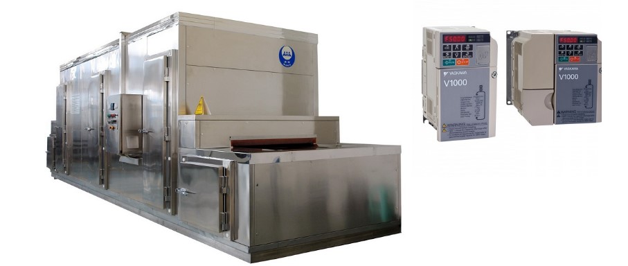 Một trong những thành phần quan trọng của băng tải cấp đông đó chính là biến tần, thường có công suất dao đồng từ 3.7kW đến 15kW tùy theo công suất của băng tải. Việc dùng biến tần ngoài việc có tác dụng chạy đồng tốc cho hai motor kéo của băng tải còn giúp cho việc có thể điều chỉnh nhanh chậm của motor 3 pha dùng trong băng tải.